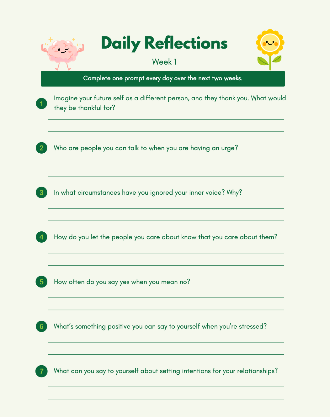 - Daily CBT Prompts: Cognitive Behavioral Therapy (CBT) prompts to help you reflect on your thoughts, feelings, and behaviors. These prompts are designed to support your mental health and help you develop healthier coping mechanisms.